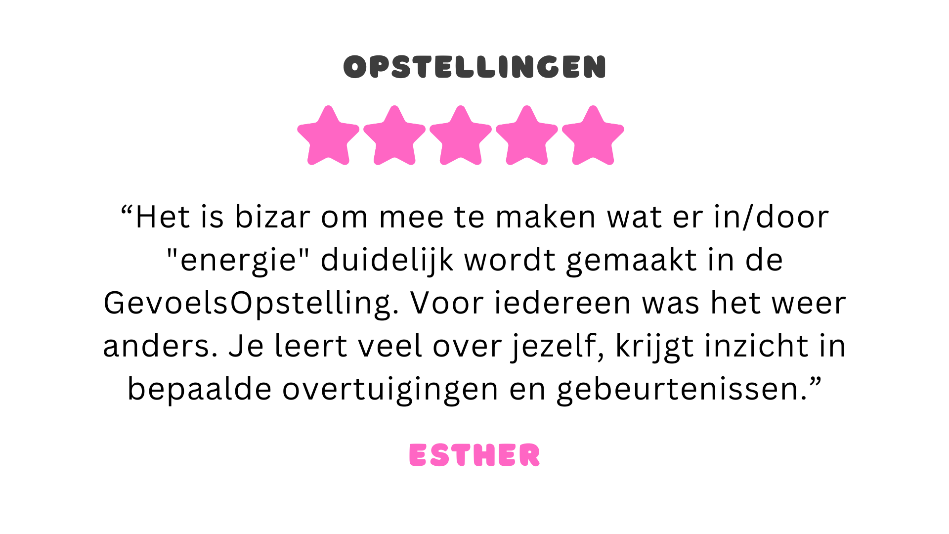 Als je hierover meer weet, laat dit dan gerust van tevoren weten. Wat je deelt helpt om de opstelling nauwkeuriger en helend te maken. Alles wat je voelt of herinnert, heeft waarde.